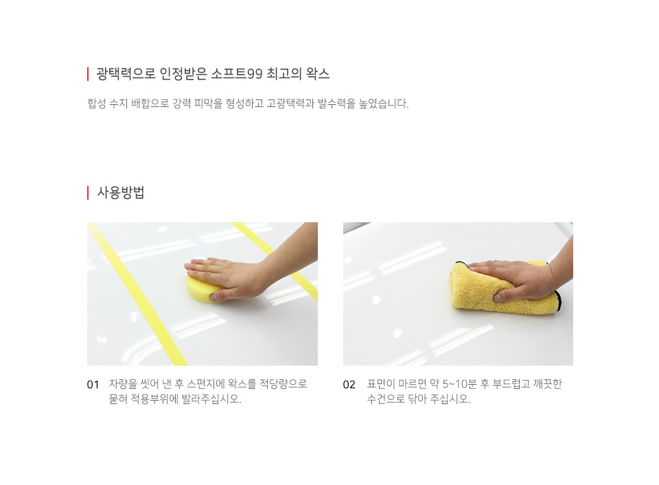 1회 시공으로 3개월간 광택력과 발수력이 유지되며 두꺼운 막이 형성되어 중후하고 깊은 광택을 얻을 수 있습니다.